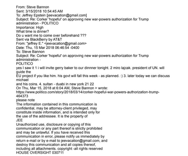 Epstein v emaile Bannonovi oznamuje, že na plánovanú večeru pozýva aj šéfredaktora denníka Wall Street Journal Geralda Bakera a Miroslava Lajčáka. Pri vtedajšom slovenskom ministrovi zahraničia Epstein píše: „Tento týždeň padne jeho vláda – ako je plánované.“