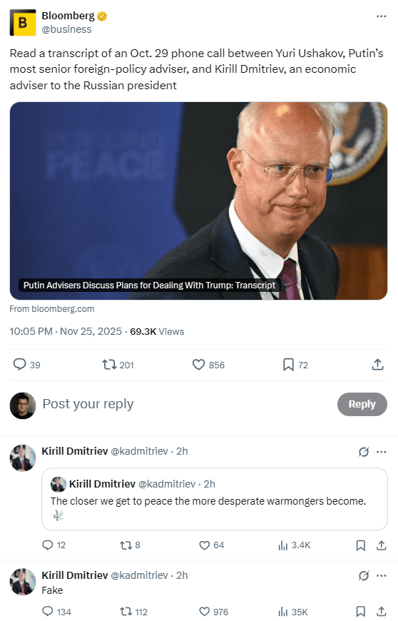 Hovorca Kremľa Dmitrij Peskov situáciu tentoraz opísal ako „informačné šialenstvo“. Zdôraznil, že iba pôvodný 28-bodový plán USA pre Rusko zostáva relevantným rámcom pre ďalšie rokovania.